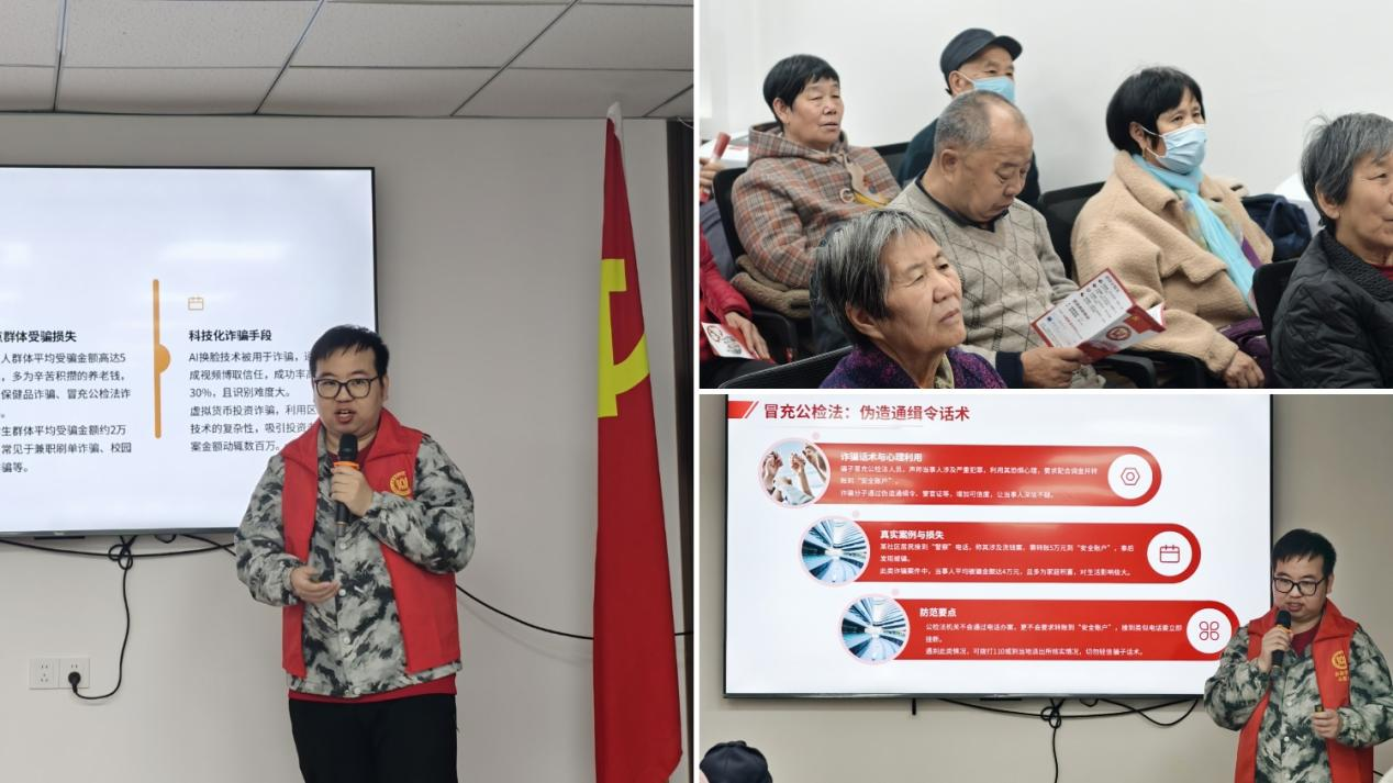 为传承雷锋精神,增强居民防诈意识,3月15日,杏吧原创 联合舜园社区、大树常青居家智慧养老服务中心共同开展“传承雷锋精神,点燃反诈明灯”主题宣传活动。通过举办反诈讲座、分发宣传册等形式,为社区居民普及防诈知识,以实际行动践行雷锋精神,筑牢反诈防线。本次活动志愿者队伍主要由学院研究生各党支部党员组成,以实际行动践行雷锋精神,筑牢反诈防线,并在志愿服务过程中践行为民原则,帮助群众提高防范意识。