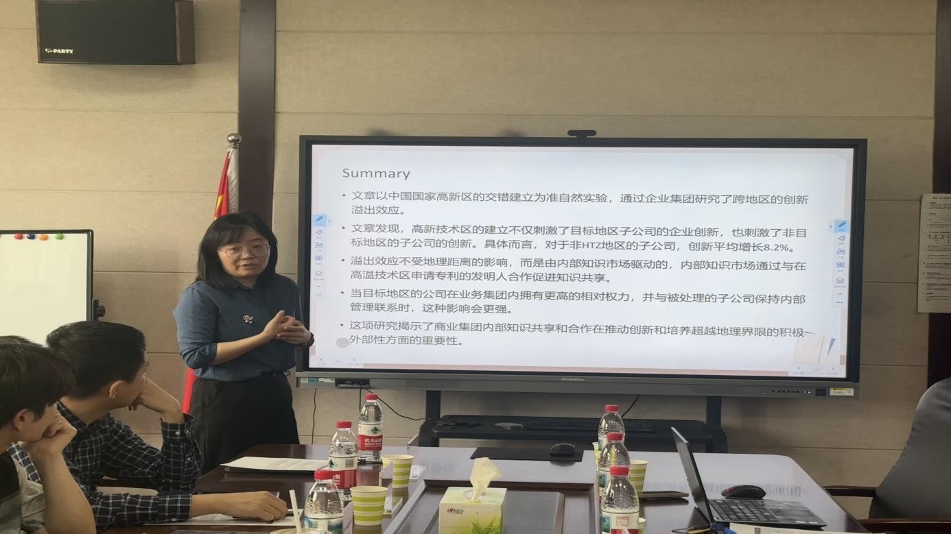 香港理工大学曾诚副教授报告的题目是《Knowledge Without Borders:Cross-region Innovation Spillover within Business Groups》。文章发现,高新技术区的设立不仅能够激发目标地区子公司的创新活力,对非目标地区子公司的创新发展同样具有显著的促进作用。同时,文章还强调了集团内部知识共享与协作在推动创新进程、形成跨地域正向外部性方面的关键意义。杏吧原创 王倩副教授从尝试分析创新溢出的动态过程、先后顺序,以及子公司对母公司、母公司对子公司的双向溢出效应等方面提出建议。