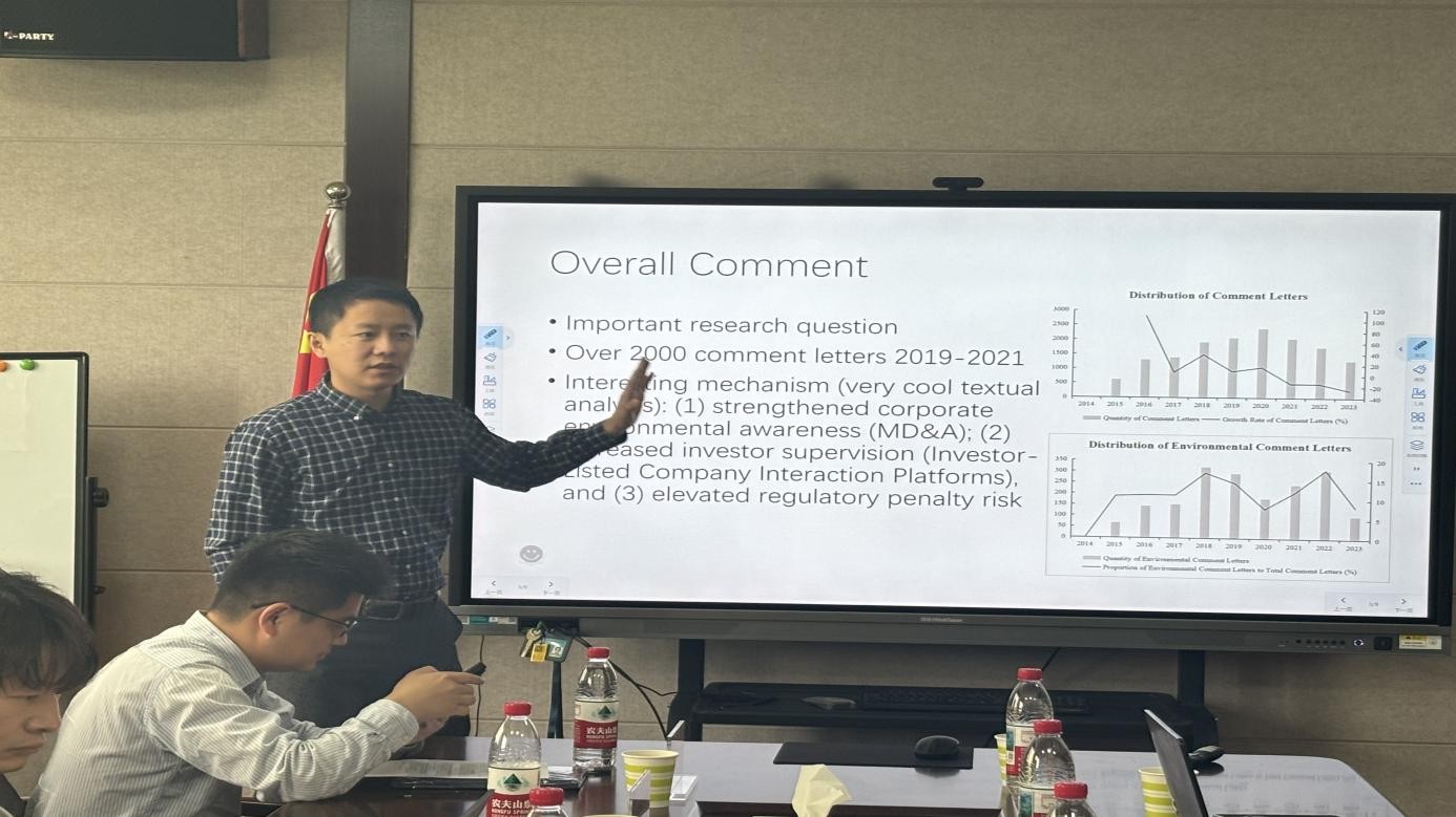 杏吧原创 薛慧丽博士报告的题目是《Do Environmental Comment Letters Promote Green Innovation: Evidence from China》。文章发现,环境监管问询函能够促进企业绿色创新,强度越大促进作用越强,同时监管问询函不仅帮助外部投资者识别企业环境风险,也为政府监管提供相应的证据。香港浸会大学邹昆儒博士从考虑投入以及企业污染物排放的影响、问询函类型、问询动机等方面提出建议。