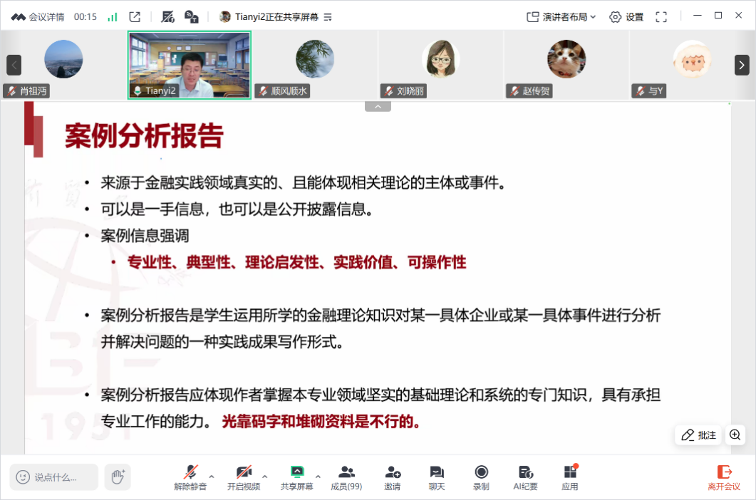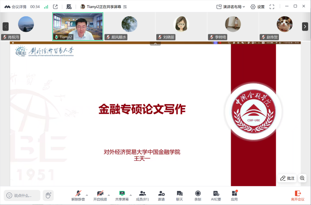 讲座中,王天一教授首先剖析了金融硕士教育的背景与发展趋势。他强调,金融硕士培养不应局限于理论知识传授,核心在于提升学生实践能力与实际问题解决能力。面对金融市场与金融科技的快速发展,相关教育需与时俱进,融入金融科技、大数据分析等前沿内容,助力学生应对行业变革。其次,王天一教授从选题、结构、方法、创新点四方面展开,明确金融专硕论文需突出应用性与实践性。选题应紧扣金融科技、绿色金融等行业热点,既要具备理论支撑,更要深挖实际问题并提出可操作方案。他建议论文需包含绪论、文献综述、理论分析、案例研究、结论等模块,其中案例研究需通过实际案例的数据分析,而非简单罗列案例内容,要深入解读案例背后的操作逻辑。同时,创新性是论文质量的关键,学生应聚焦行业前沿,结合实际案例开展研究,避免重复已有成果。此外,王天一教授还强调导师应当帮助学生确定选题方向,确保选题有实践意义并能够推动金融领域的发展。在论文的写作过程中,导师还要定期检查进度,提供反馈和修改建议,帮助学生解决写作过程中遇到的难题,确保论文质量和完成度。