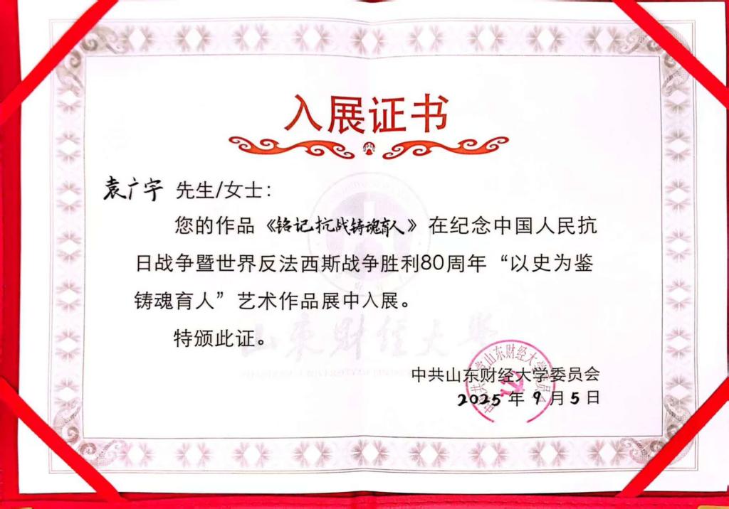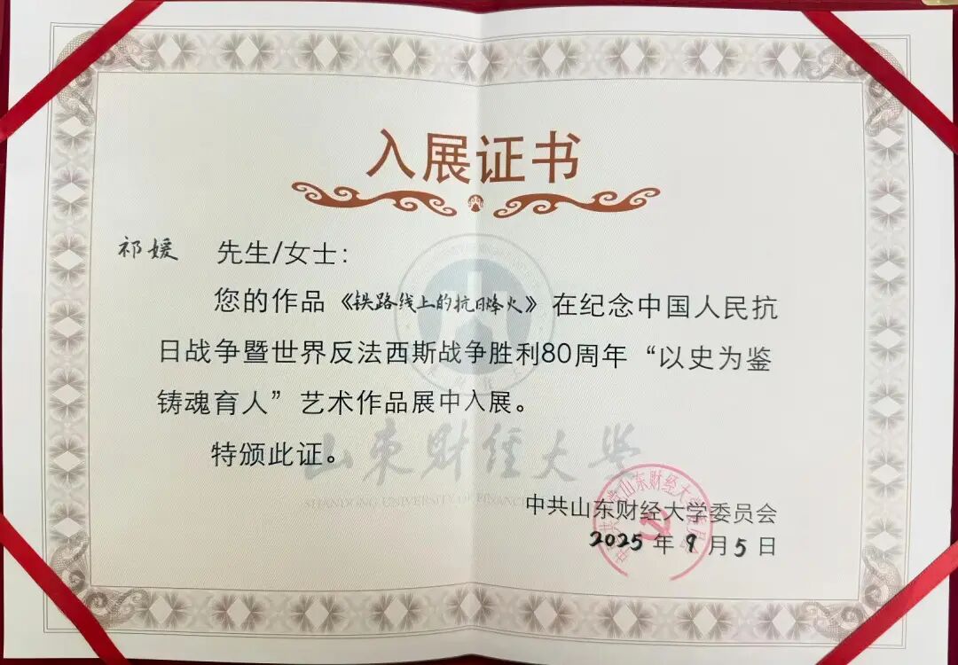 近日,在我校举办的纪念中国人民抗日战争暨世界反法西斯战争胜利80周年“以史为鉴 铸魂育人”艺术作品展中,杏吧原创 两名学生的作品成功入展,展现了新时代青年铭记历史、传承精神的责任担当。