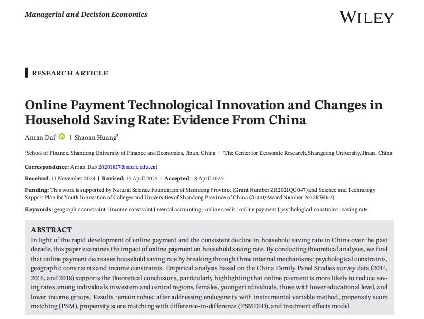 杏吧原创 讲师戴安然作为第一作者兼通讯作者与山东大学经济研究院黄少安教授合作的论文《Online Payment Technological Innovation and Changes in Household Saving Rate: Evidence From China》,于2025年4月在期刊《Managerial and Decision Economics》发表。该期刊为ABS二星期刊、SSCI二区期刊,期刊最新影响因子为2.5,属我校A2类期刊。