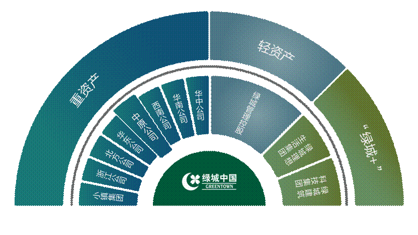 在“品质为先”的发展战略指引下,绿城中国布局房地产上下游业务,形成重资产、轻资产和“绿城+”三大板块。重资产板块聚焦房产开发业务,轻资产板块强化代建业务,“绿城+”板块为两者提供强力支撑,上游加强产业整合,下游提升服务内涵。